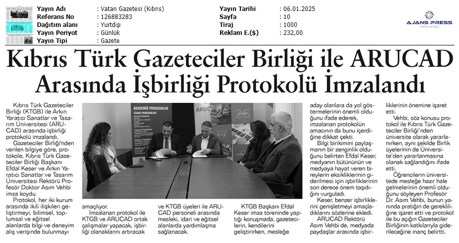 Kıbrıs Türk Gazeteciler Birliği ile ARUCAD Arasında İşbirliği Protokolü İmzalandı