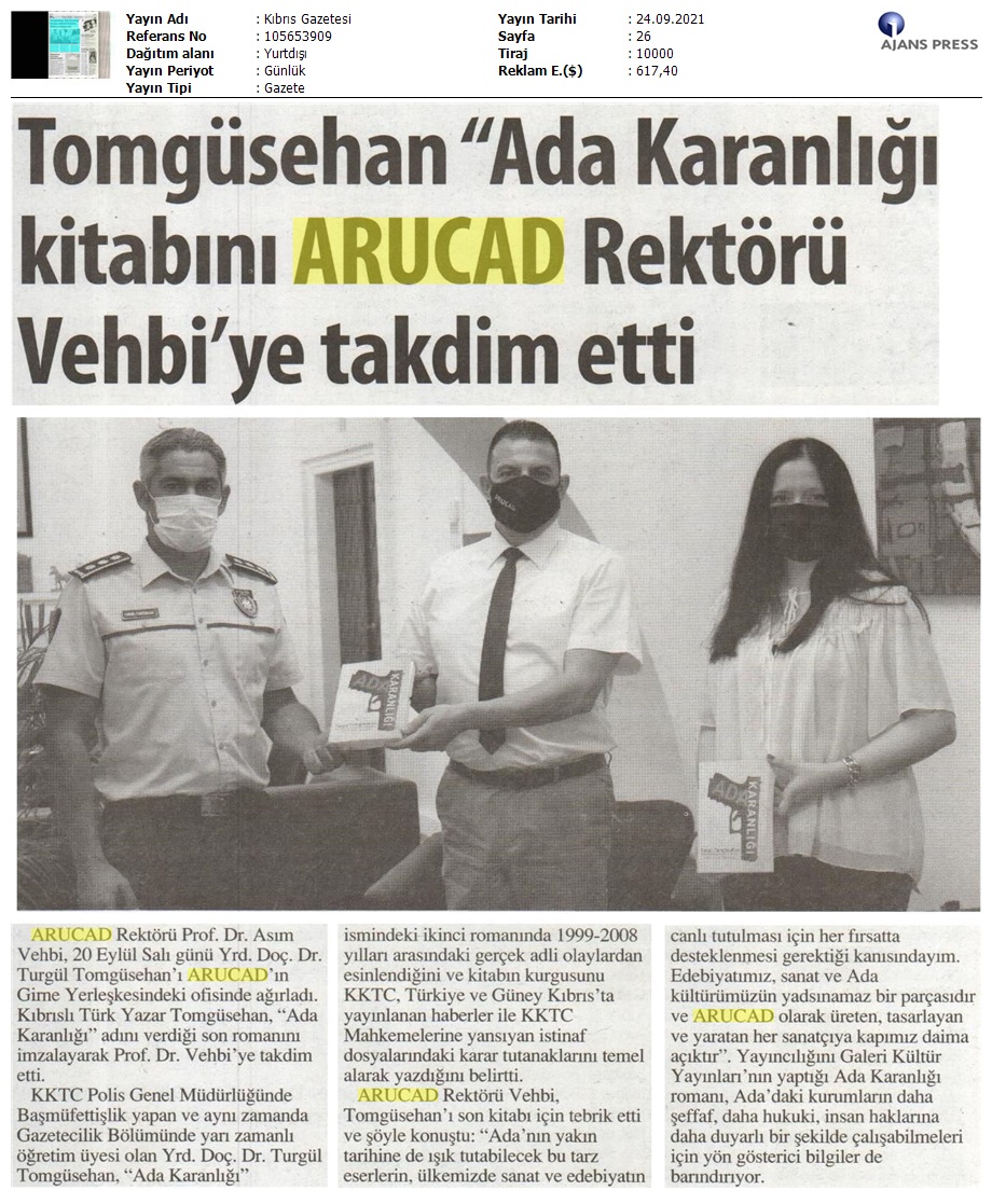 Turgül Tomgüsehan Son Kitabı “Ada Karanlığı”‘nı ARUCAD Rektörü Prof. Dr. Asım Vehbi’ye Takdim Etti